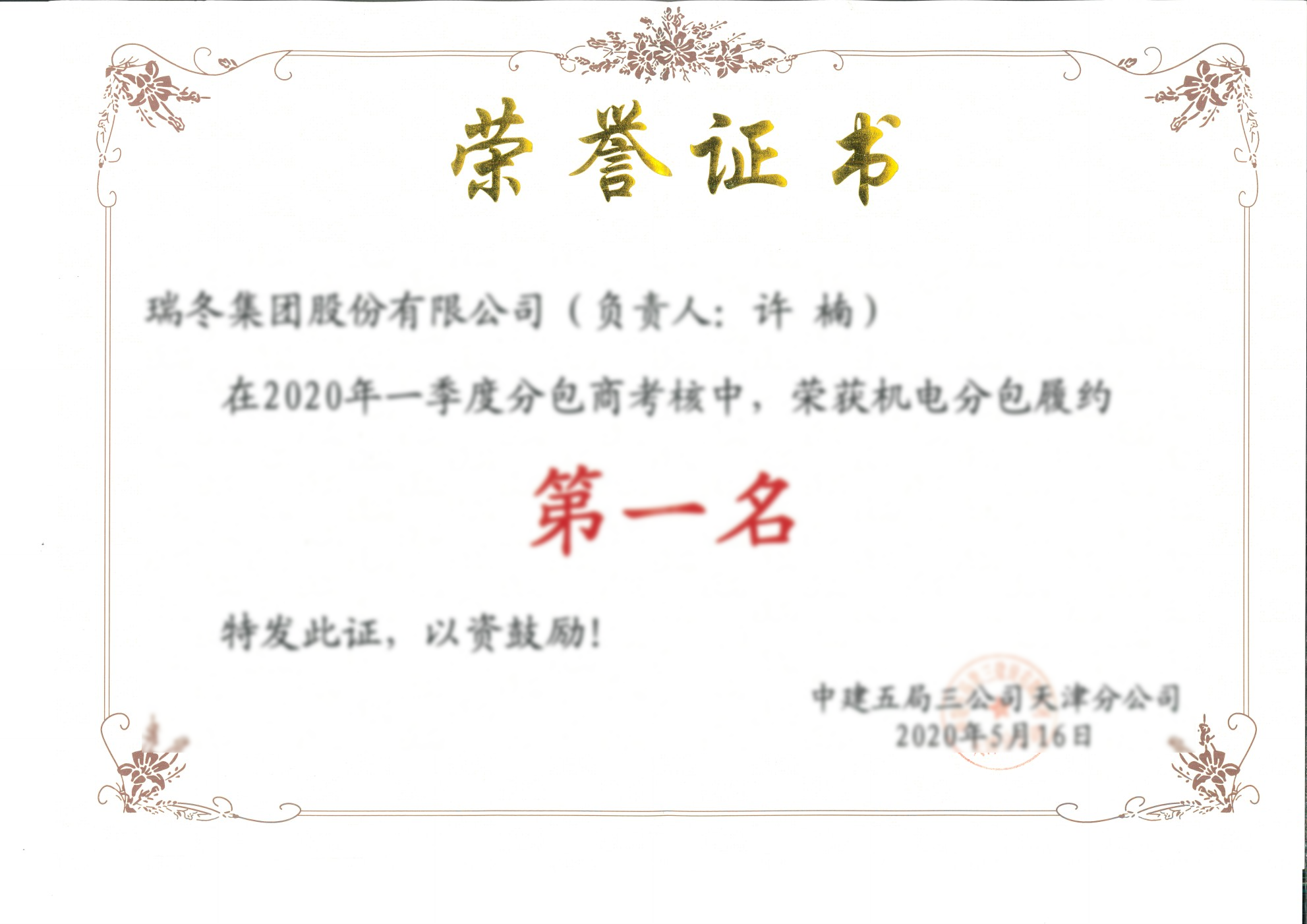 分包商机电分包履约第一名
