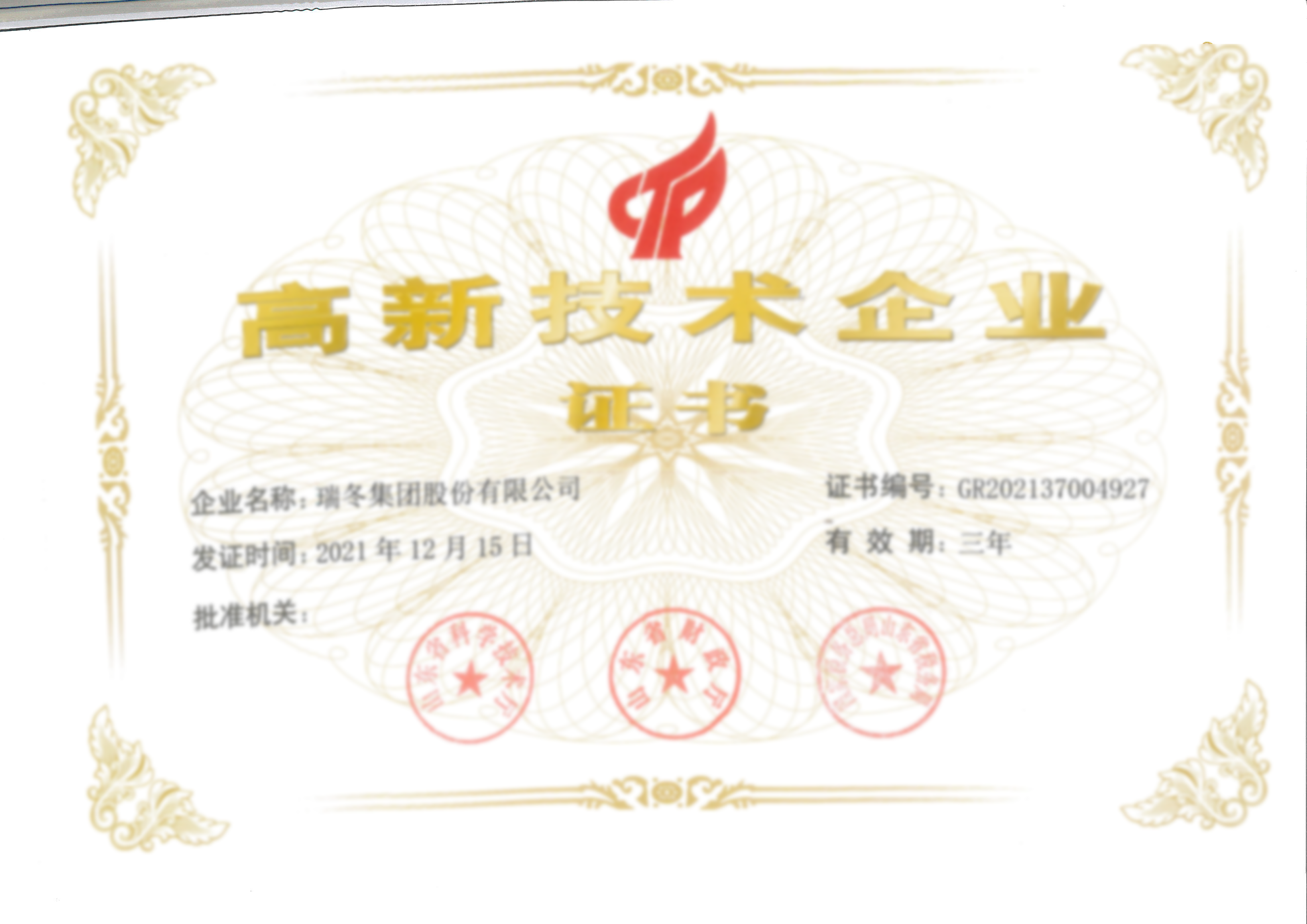 高新技术企业证书