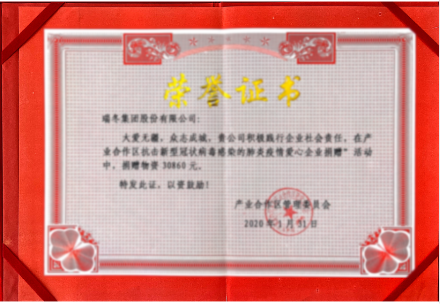 产业合作区爱心企业捐赠荣誉证书
