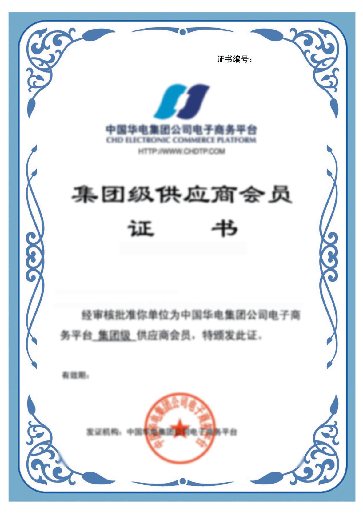 中国华电集团公司电子商务平台集团级供应商会员证书