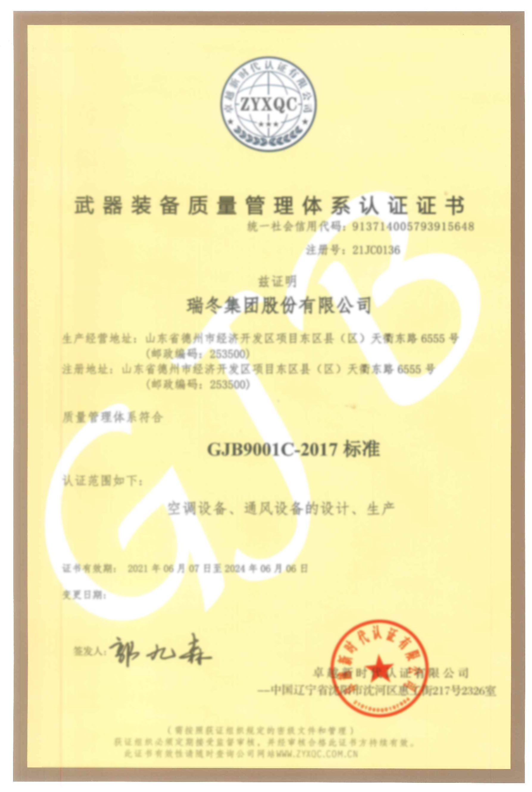 武器装备质量管理体系认证证书
