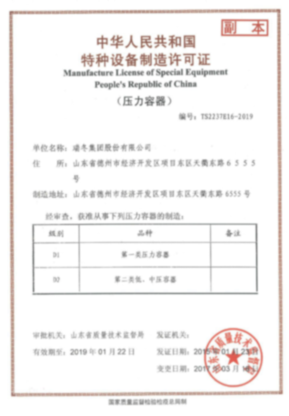 中华人民共和国特种设备制造许可证(压力容器)