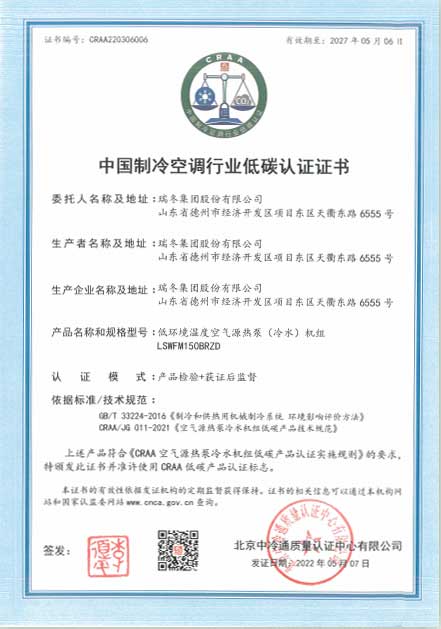 中国制冷空调行业低碳认证证书